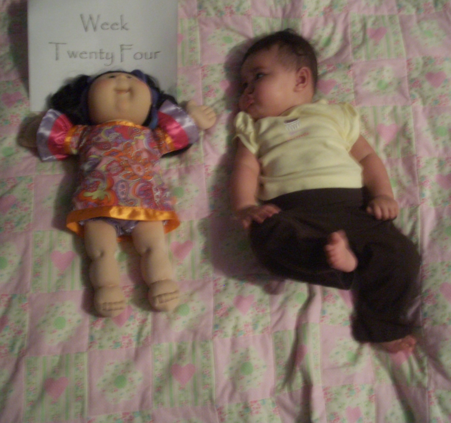 You couldn't tell from these pics but Baby Girl's been sick again so she took it easy this week. She did surprise Mama by making some WWF moves to her Cabbage Patch Doll during her weekly photo shoot. Check out her moves!
